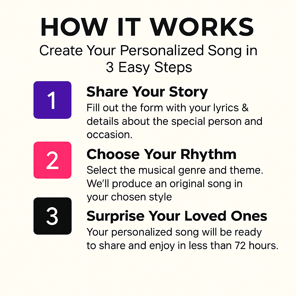 Imagine your unique story turned into a beautiful melody that's yours alone. A custom song from our site is more than music. Itβs a heartfelt, personal gift for weddings, anniversaries, birthdays, or any special moment. It captures emotions and memories in a way words canβt, becoming a timeless keepsake and a lasting expression of love.